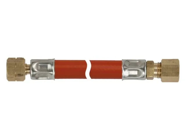 Gumová plynová hadice s mosaznými kabelovými průchodkami a nerezovými upínacími trubkami.