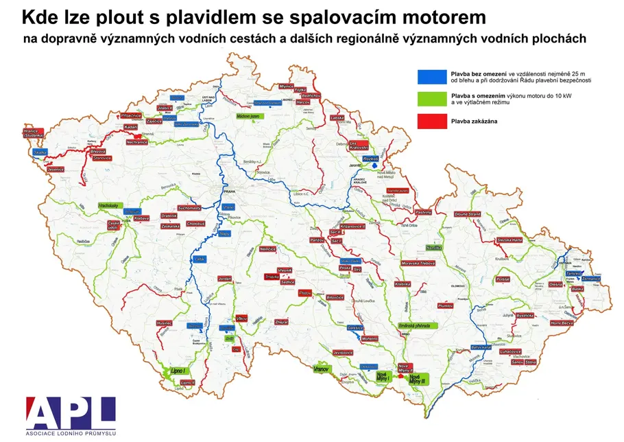 Z odst. 5 § 7 zákona 254/2001 Sb., o vodách, vyplývá, že plavba plavidel se spalovacími motory je zakázána na povrchových vodách v ochranných pásmech vodních zdrojů I. stupně a na nádržích určených rozhodnutím vodoprávního úřadu podle § 8 odst. 1 písm. a) bodu 4 nebo podle předchozích předpisů pro chov ryb.